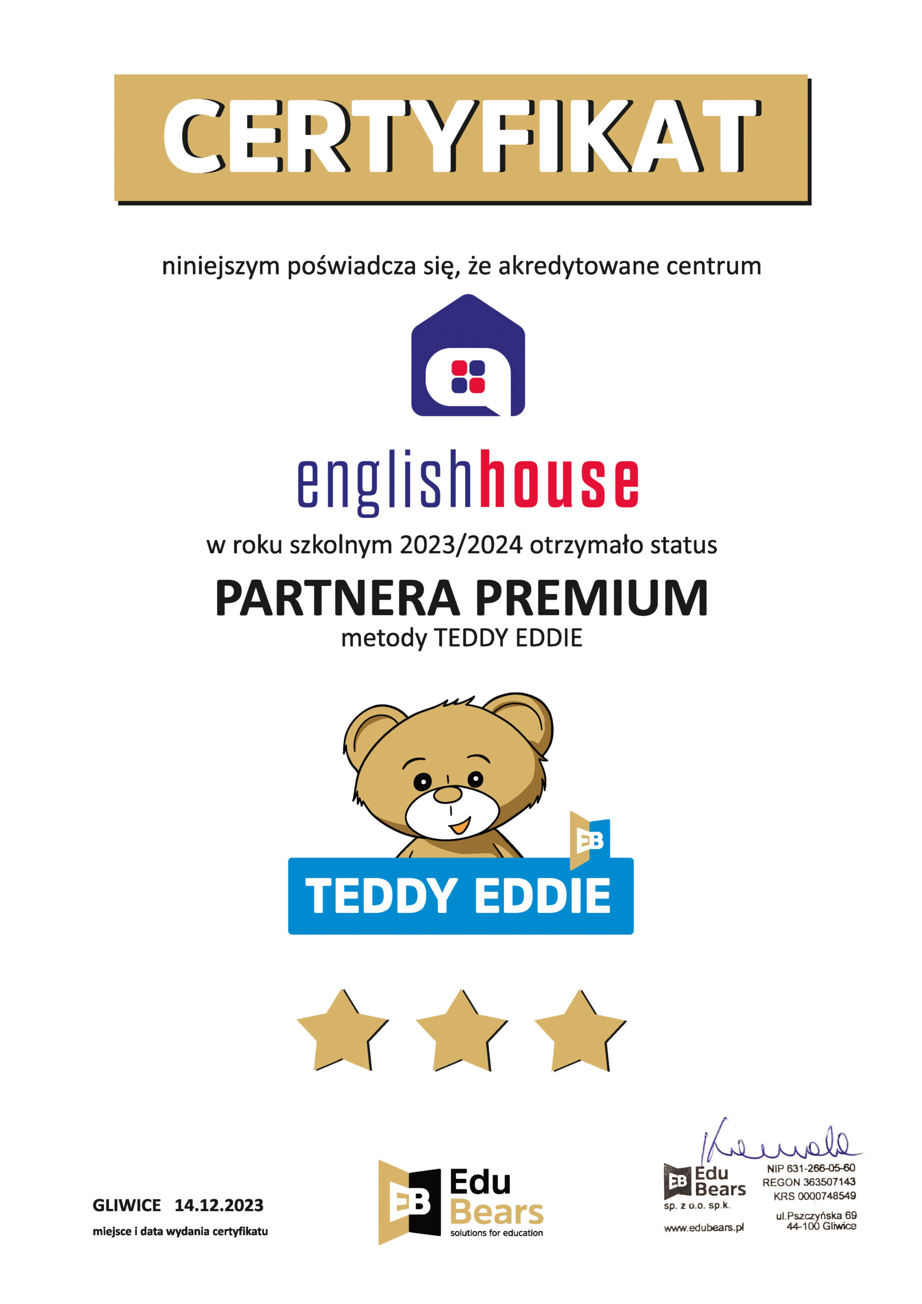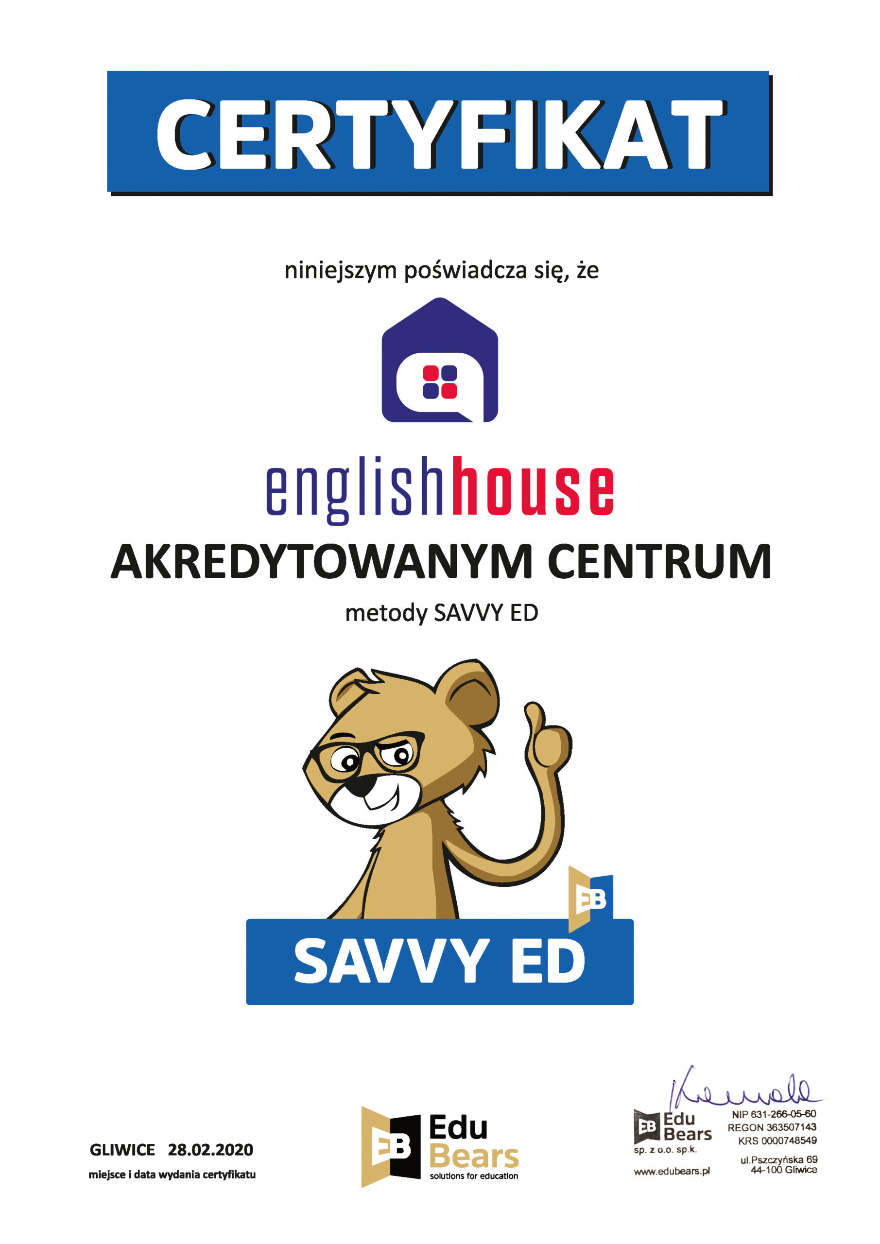 Szkoła English House jest nowoczesnym centrum językowym głównie dla dzieci i młodzieży. Jesteśmy Akredytowanym Centrum Metody Teddy Eddie oraz Savvy Ed. Posiadamy status Centrum Przygotowującego do Egzaminów Cambridge.