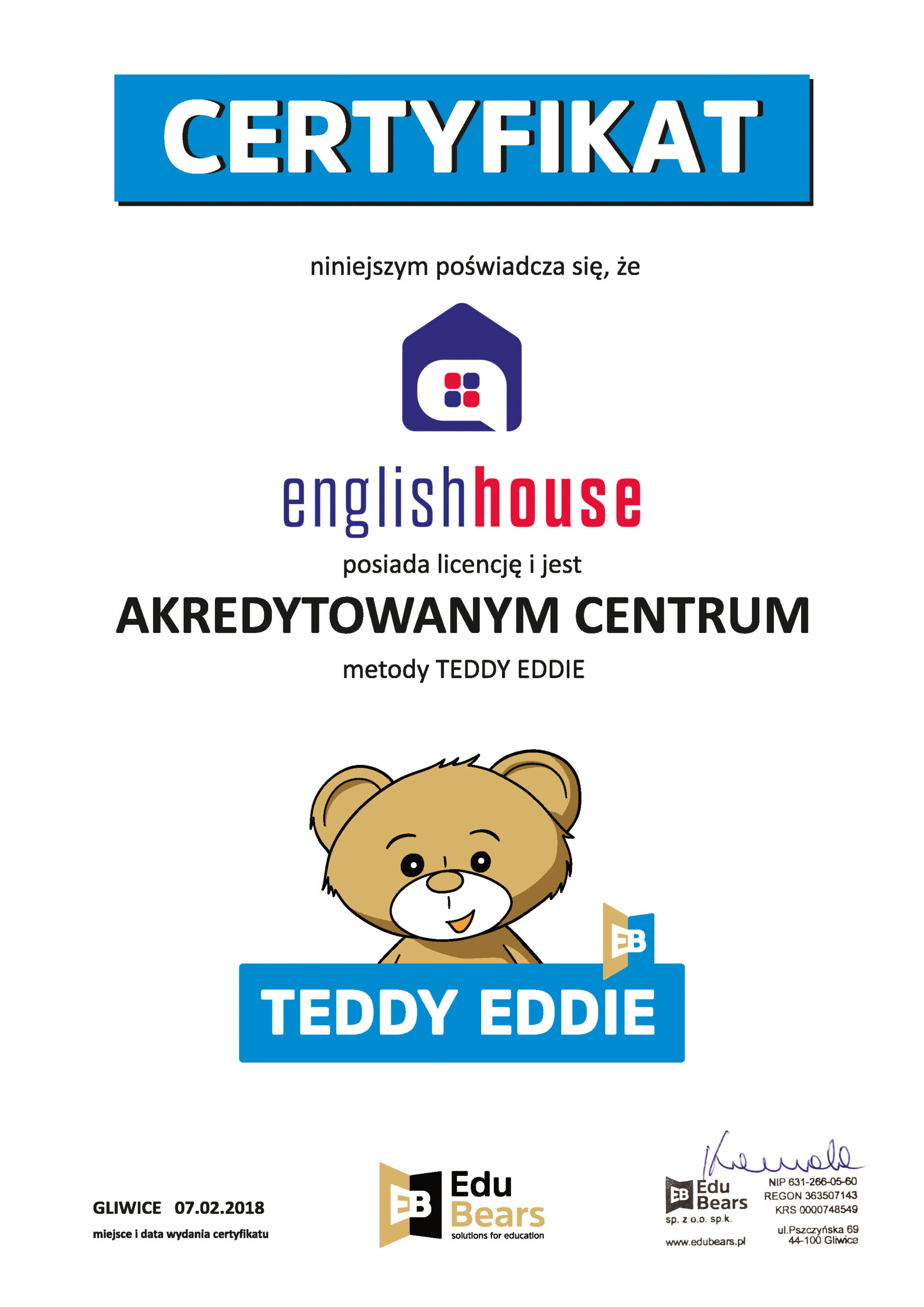 Jesteśmy jedynym Akredytowanym Centrum metody nauczania języka angielskiego dla dzieci Teddy Eddie